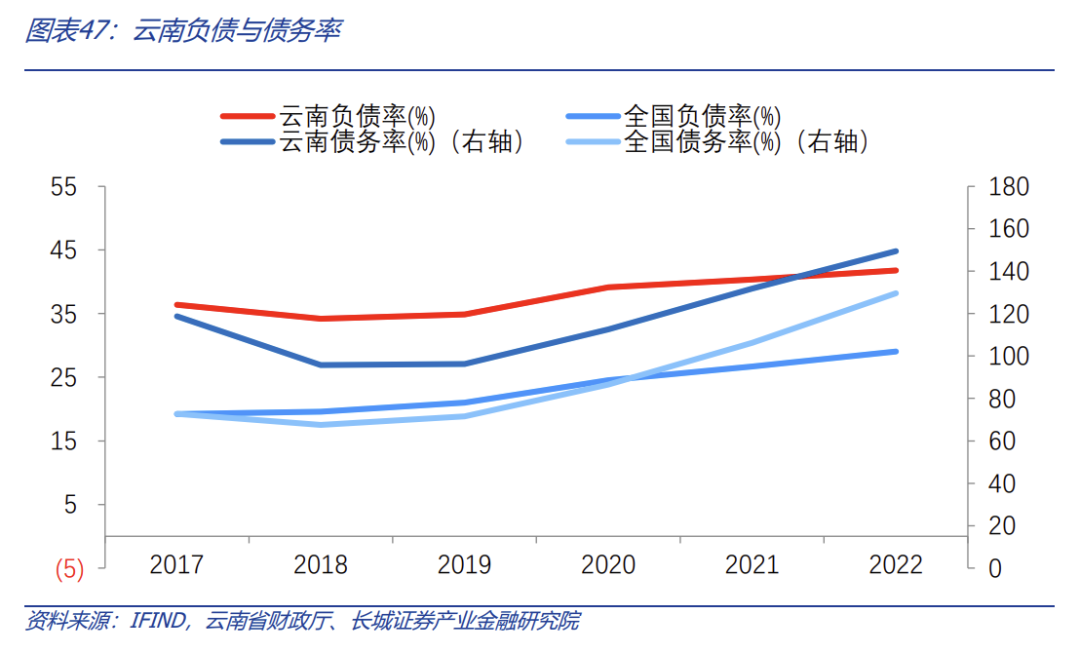 近五年云南省償債壓力上升,總體略高于全國平均水平。2022年GDP位列全國第十八位。GDP增速位居全國二十三名。云南負債率雖然在2018年有了微弱的下降,但2020年有了一定程度的提升,整體呈上升趨勢,且和全國平均負債率有明顯的差距。從總體償債壓力來看,2022年云南省負債率(地方政府債務余額/GDP)為41.78%,明顯高于全國各省市平均水平(29.04%)。在最近五年內,云南省負債率由2017年36.38%上升至2022年41.78%,顯示出云南省的負債規(guī)模較高,可見雖云南省償債壓力逐年加大,但增幅不明顯。