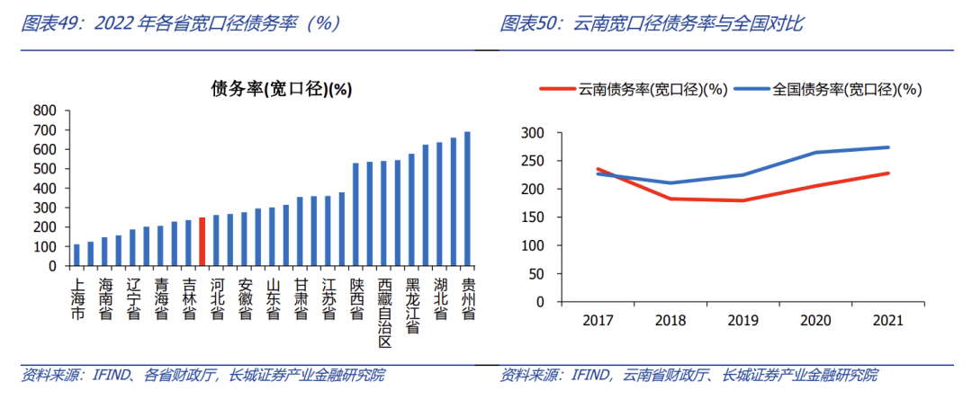 將城投債余額也納入債務后,云南省寬口徑債務率明顯低于全國平均水平,且全國排名處于較低水平。云南省寬口徑債務率從2017年的235.21%上升至2022年的248.38%,低于全國平均值351.12%。云南省寬口徑債務率年增長為0.81%,遠低于全國平均增長率4.83%,顯示云南省控制地方政府隱形債務有一定成效,但依然要注意對于整體債務率的控制。