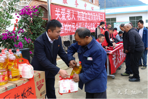 12月14日,在黔南州獨山縣麻萬鎮(zhèn)三里村村委會廣場,食用油、面條、洗潔精等生活物資整齊擺放,500多名60歲以上老人齊聚廣場,在工作人員的帶領(lǐng)下,老人們手持身份證排隊簽字,領(lǐng)取今年的“健康分紅”。
