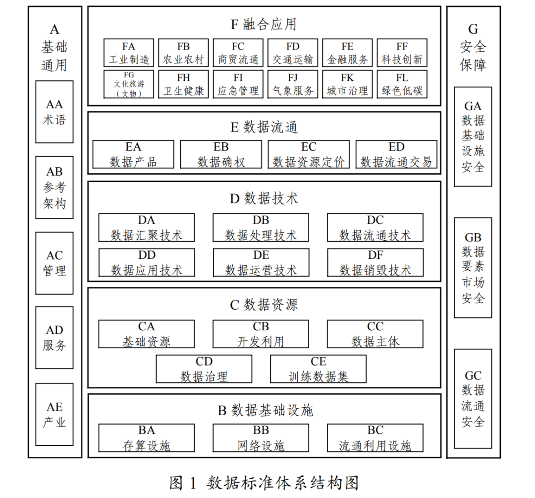以數(shù)據(jù)“供得出、流得動、用得好、保安全”為指引,構(gòu)建數(shù)據(jù)標(biāo)準(zhǔn)體系。數(shù)據(jù)標(biāo)準(zhǔn)體系結(jié)構(gòu)包括A基礎(chǔ)通用、B數(shù)據(jù)基礎(chǔ)設(shè)施、C數(shù)據(jù)資源、D數(shù)據(jù)技術(shù)、E數(shù)據(jù)流通、F融合應(yīng)用、G安全保障等7個部分,主要反映標(biāo)準(zhǔn)體系各部分的組成關(guān)系。數(shù)據(jù)標(biāo)準(zhǔn)體系結(jié)構(gòu)如圖1所示。A基礎(chǔ)通用標(biāo)準(zhǔn)包括術(shù)語、參考架構(gòu)、管理、服務(wù)、產(chǎn)業(yè)等,位于數(shù)據(jù)標(biāo)準(zhǔn)體系結(jié)構(gòu)的最左側(cè),支撐標(biāo)準(zhǔn)體系結(jié)構(gòu)中其他部分。B數(shù)據(jù)基礎(chǔ)設(shè)施標(biāo)準(zhǔn)以現(xiàn)有相關(guān)標(biāo)準(zhǔn)為主,強化基礎(chǔ)設(shè)施互聯(lián)互通、算力保障和流通利用標(biāo)準(zhǔn)建設(shè),為數(shù)據(jù)資源、數(shù)據(jù)技術(shù)、數(shù)據(jù)流通、融合應(yīng)用提供支撐。C數(shù)據(jù)資源標(biāo)準(zhǔn)聚焦基礎(chǔ)資源、開發(fā)利用、數(shù)據(jù)主體、數(shù)據(jù)治理和訓(xùn)練數(shù)據(jù)集,為數(shù)據(jù)資源高質(zhì)量供給提供標(biāo)準(zhǔn)支撐。D數(shù)據(jù)技術(shù)標(biāo)準(zhǔn)聚焦數(shù)據(jù)匯聚、處理、流通、應(yīng)用、運營、銷毀等技術(shù),為數(shù)據(jù)生命周期提供技術(shù)標(biāo)準(zhǔn)支撐。E數(shù)據(jù)流通標(biāo)準(zhǔn)聚焦數(shù)據(jù)產(chǎn)品、確權(quán)、資源定價、流通交易等環(huán)節(jié),為數(shù)據(jù)有序流通提供標(biāo)準(zhǔn)支撐。F融合應(yīng)用標(biāo)準(zhǔn)位于數(shù)據(jù)標(biāo)準(zhǔn)體系結(jié)構(gòu)的最頂端,聚焦《“數(shù)據(jù)要素×”三年行動計劃(2024—2026年)》重點行業(yè)領(lǐng)域,為行業(yè)領(lǐng)域數(shù)據(jù)管理應(yīng)用、數(shù)字化水平評價、數(shù)據(jù)服務(wù)能力評估、轉(zhuǎn)型成效評價等融合應(yīng)用提供標(biāo)準(zhǔn)支撐。G安全保障標(biāo)準(zhǔn)包括數(shù)據(jù)基礎(chǔ)設(shè)施安全、數(shù)據(jù)要素市場安全、數(shù)據(jù)流通安全等,位于數(shù)據(jù)標(biāo)準(zhǔn)體系結(jié)構(gòu)的最右端,為標(biāo)準(zhǔn)體系建設(shè)提供合規(guī)保障。(二)數(shù)據(jù)標(biāo)準(zhǔn)體系框架