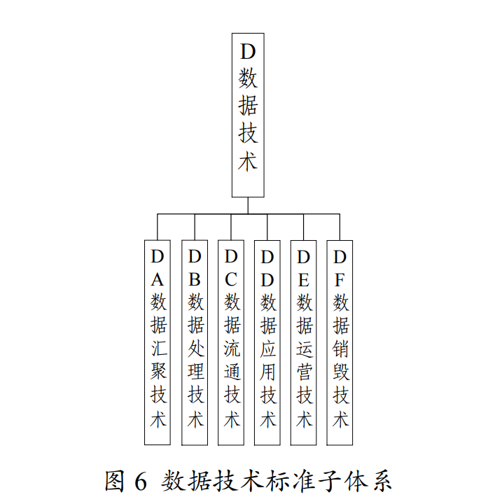 主要包括數(shù)據(jù)匯聚技術(shù)、數(shù)據(jù)處理技術(shù)、數(shù)據(jù)流通技術(shù)、數(shù)據(jù)應(yīng)用技術(shù)、數(shù)據(jù)運營技術(shù)、數(shù)據(jù)銷毀技術(shù)等,如圖6所示。1.數(shù)據(jù)匯聚技術(shù)標(biāo)準(zhǔn)主要規(guī)范多類型數(shù)據(jù)的采集和接入?yún)R聚技術(shù),以及多源異構(gòu)數(shù)據(jù)接入、格式轉(zhuǎn)換、資源調(diào)度的技術(shù)要求。包括數(shù)據(jù)采集、數(shù)據(jù)解析、數(shù)據(jù)提取、數(shù)據(jù)接入、數(shù)據(jù)傳輸?shù)燃夹g(shù)要求標(biāo)準(zhǔn)。2.數(shù)據(jù)處理技術(shù)標(biāo)準(zhǔn)主要規(guī)范數(shù)據(jù)存儲、計算、加工的技術(shù)要求。包括數(shù)據(jù)存儲、數(shù)據(jù)倉儲管理、數(shù)據(jù)清洗、數(shù)據(jù)分析、數(shù)據(jù)挖掘、數(shù)據(jù)批流計算、數(shù)據(jù)分布式處理、數(shù)據(jù)識別等技術(shù)要求標(biāo)準(zhǔn)。3.數(shù)據(jù)流通技術(shù)標(biāo)準(zhǔn)主要規(guī)范數(shù)據(jù)接口、標(biāo)識、管控等的技術(shù)要求。包括數(shù)據(jù)接口、數(shù)據(jù)標(biāo)識、跨域管控、數(shù)據(jù)血緣等技術(shù)要求標(biāo)準(zhǔn)。4.數(shù)據(jù)應(yīng)用技術(shù)標(biāo)準(zhǔn)主要規(guī)范各行業(yè)領(lǐng)域數(shù)據(jù)融合應(yīng)用的技術(shù)要求。包括支撐行業(yè)領(lǐng)域數(shù)據(jù)技術(shù)要求、應(yīng)用服務(wù)要求等標(biāo)準(zhǔn)。5.數(shù)據(jù)運營技術(shù)標(biāo)準(zhǔn)主要規(guī)范數(shù)據(jù)高效運營的技術(shù)要求。包括數(shù)據(jù)動態(tài)監(jiān)測、數(shù)據(jù)需求分析、數(shù)據(jù)交互、數(shù)據(jù)交付、數(shù)據(jù)使用服務(wù)和處置等技術(shù)要求標(biāo)準(zhǔn)。6.數(shù)據(jù)銷毀技術(shù)標(biāo)準(zhǔn)主要規(guī)范數(shù)據(jù)有效銷毀的技術(shù)要求。包括數(shù)據(jù)銷毀處理等技術(shù)要求標(biāo)準(zhǔn)。