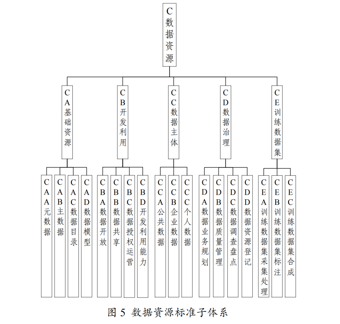 主要包括基礎(chǔ)資源、開發(fā)利用、數(shù)據(jù)主體、數(shù)據(jù)治理、訓(xùn)練數(shù)據(jù)集等,如圖5所示。1.基礎(chǔ)資源標(biāo)準(zhǔn)主要包括元數(shù)據(jù)、主數(shù)據(jù)、數(shù)據(jù)目錄、數(shù)據(jù)模型等標(biāo)準(zhǔn)。(1)元數(shù)據(jù)標(biāo)準(zhǔn)。主要規(guī)范元數(shù)據(jù)的描述、管理和應(yīng)用。包括元數(shù)據(jù)管理、注冊、編碼、交換要求,以及公共數(shù)據(jù)字典、基本數(shù)據(jù)集元數(shù)據(jù)等標(biāo)準(zhǔn)。(2)主數(shù)據(jù)標(biāo)準(zhǔn)。主要規(guī)范主數(shù)據(jù)的描述、管理和應(yīng)用。包括主數(shù)據(jù)分類、管理、編碼、質(zhì)量等標(biāo)準(zhǔn)。(3)數(shù)據(jù)目錄標(biāo)準(zhǔn)。主要規(guī)范數(shù)據(jù)目錄的編制、管理和維護(hù)等。包括數(shù)據(jù)目錄編制指南、編碼要求、要素要求、服務(wù)要求、系統(tǒng)接入要求等標(biāo)準(zhǔn)。(4)數(shù)據(jù)模型標(biāo)準(zhǔn)。主要規(guī)范數(shù)據(jù)模型的架構(gòu)、建設(shè)和維護(hù)等。包括數(shù)據(jù)模型參考架構(gòu)、管理要求、成熟度等標(biāo)準(zhǔn)。主要包括數(shù)據(jù)開放、數(shù)據(jù)共享、數(shù)據(jù)授權(quán)運營、開發(fā)利用能力等標(biāo)準(zhǔn)。(1)數(shù)據(jù)開放標(biāo)準(zhǔn)。主要規(guī)范數(shù)據(jù)的開放要求、開放目錄、平臺系統(tǒng)、評價要求等。包括數(shù)據(jù)開放要求、目錄,以及系統(tǒng)平臺要求、評價等標(biāo)準(zhǔn)。(2)數(shù)據(jù)共享標(biāo)準(zhǔn)。主要規(guī)范數(shù)據(jù)實現(xiàn)跨系統(tǒng)、跨部門、跨層級、跨區(qū)域共享的程序要求、系統(tǒng)平臺、評價要求等。包括數(shù)據(jù)共享流程、系統(tǒng)平臺要求、方式、評價等標(biāo)準(zhǔn)。(3)數(shù)據(jù)授權(quán)運營標(biāo)準(zhǔn)。主要規(guī)范數(shù)據(jù)授權(quán)運營的架構(gòu)、管理、服務(wù)、平臺和成效等。包括數(shù)據(jù)授權(quán)運營參考架構(gòu)、管理要求、服務(wù)目錄、平臺建設(shè)、績效評估等標(biāo)準(zhǔn)。(4)開發(fā)利用能力標(biāo)準(zhǔn)。主要規(guī)范數(shù)據(jù)開發(fā)利用能力要求、評估等。包括數(shù)據(jù)開發(fā)利用能力要求、評估等標(biāo)準(zhǔn)。3.數(shù)據(jù)主體標(biāo)準(zhǔn)主要包括公共數(shù)據(jù)、企業(yè)數(shù)據(jù)、個人數(shù)據(jù)等標(biāo)準(zhǔn)。(1)公共數(shù)據(jù)標(biāo)準(zhǔn)。主要規(guī)范公共數(shù)據(jù)為主體的基礎(chǔ)屬性和衍生屬性。包括公共數(shù)據(jù)指南、基本要求等標(biāo)準(zhǔn)。(2)企業(yè)數(shù)據(jù)標(biāo)準(zhǔn)。主要規(guī)范企業(yè)數(shù)據(jù)為主體的基礎(chǔ)屬性和衍生屬性。包括企業(yè)數(shù)據(jù)基本要求等標(biāo)準(zhǔn)。(3)個人數(shù)據(jù)標(biāo)準(zhǔn)。從數(shù)據(jù)產(chǎn)權(quán)角度,主要規(guī)范個人作為市場主體,掌握、持有相關(guān)數(shù)據(jù)和產(chǎn)品的數(shù)據(jù)資源持有權(quán)、數(shù)據(jù)加工使用權(quán)、數(shù)據(jù)產(chǎn)品經(jīng)營權(quán)等合法權(quán)利。4.數(shù)據(jù)治理標(biāo)準(zhǔn)主要包括數(shù)據(jù)業(yè)務(wù)規(guī)劃、數(shù)據(jù)質(zhì)量管理、數(shù)據(jù)調(diào)查盤點、數(shù)據(jù)資源登記等標(biāo)準(zhǔn)。(1)數(shù)據(jù)業(yè)務(wù)規(guī)劃標(biāo)準(zhǔn)。主要規(guī)范實現(xiàn)數(shù)據(jù)業(yè)務(wù)規(guī)劃目標(biāo)所需的數(shù)據(jù)構(gòu)成與資源體系。包括數(shù)據(jù)業(yè)務(wù)規(guī)劃要求、規(guī)劃實施流程、分類等標(biāo)準(zhǔn)。(2)數(shù)據(jù)質(zhì)量管理標(biāo)準(zhǔn)。主要規(guī)范數(shù)據(jù)全生命周期質(zhì)量的管理、管控與評價。包括數(shù)據(jù)質(zhì)量評價指標(biāo)、評價方法、管理要求、處理要求等標(biāo)準(zhǔn)。(3)數(shù)據(jù)調(diào)查盤點標(biāo)準(zhǔn)。主要規(guī)范數(shù)據(jù)調(diào)查盤點的程序、模型等。包括數(shù)據(jù)調(diào)查盤點程序要求、模型規(guī)范等標(biāo)準(zhǔn)。(4)數(shù)據(jù)資源登記標(biāo)準(zhǔn)。主要規(guī)范數(shù)據(jù)資源登記內(nèi)容、登記程序、管理與服務(wù)評價等。包括數(shù)據(jù)資源登記管理要求、實施流程、信息、憑證、平臺管理等標(biāo)準(zhǔn)。5.訓(xùn)練數(shù)據(jù)集標(biāo)準(zhǔn)主要包括訓(xùn)練數(shù)據(jù)集采集處理、標(biāo)注、合成等標(biāo)準(zhǔn)。(1)訓(xùn)練數(shù)據(jù)集采集處理標(biāo)準(zhǔn)。主要規(guī)范適用于大模型訓(xùn)練數(shù)據(jù)集的采集與處理要求。包括訓(xùn)練數(shù)據(jù)集格式要求、分類分級、采集性能、分析監(jiān)測、質(zhì)量要求等標(biāo)準(zhǔn)。(2)訓(xùn)練數(shù)據(jù)集標(biāo)注標(biāo)準(zhǔn)。主要規(guī)范適用于大模型訓(xùn)練數(shù)據(jù)集的標(biāo)注質(zhì)量要求。包括訓(xùn)練數(shù)據(jù)集標(biāo)注技術(shù)要求、規(guī)程、方法、能力評估等標(biāo)準(zhǔn)。(3)訓(xùn)練數(shù)據(jù)集合成標(biāo)準(zhǔn)。主要規(guī)范適用于大模型訓(xùn)練數(shù)據(jù)集的合成要求。包括訓(xùn)練數(shù)據(jù)集合成技術(shù)、服務(wù)、工具