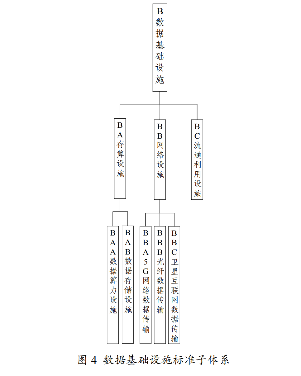 主要包括存算設(shè)施、網(wǎng)絡(luò)設(shè)施、流通利用設(shè)施等,如圖4所示。1.存算設(shè)施標(biāo)準(zhǔn)主要包括數(shù)據(jù)算力設(shè)施、數(shù)據(jù)存儲設(shè)施等標(biāo)準(zhǔn)。(1)數(shù)據(jù)算力設(shè)施標(biāo)準(zhǔn)。主要規(guī)范用于數(shù)據(jù)采集、處理等的基礎(chǔ)算力建設(shè)。包括數(shù)據(jù)算力資源分類、網(wǎng)絡(luò)架構(gòu)、虛擬化、軟硬件檢測,以及算力能力等標(biāo)準(zhǔn)。(2)數(shù)據(jù)存儲設(shè)施標(biāo)準(zhǔn)。主要規(guī)范用于數(shù)據(jù)存儲的基礎(chǔ)設(shè)施建設(shè)。包括數(shù)據(jù)存儲管理、接口、性能分級、軟硬件檢測,以及數(shù)據(jù)流量控制、數(shù)據(jù)容災(zāi)備份等標(biāo)準(zhǔn)。2.網(wǎng)絡(luò)設(shè)施標(biāo)準(zhǔn)主要包括5G網(wǎng)絡(luò)數(shù)據(jù)傳輸、光纖數(shù)據(jù)傳輸、衛(wèi)星互聯(lián)網(wǎng)數(shù)據(jù)傳輸?shù)葮?biāo)準(zhǔn)。(1)5G網(wǎng)絡(luò)數(shù)據(jù)傳輸標(biāo)準(zhǔn)。主要規(guī)范5G網(wǎng)絡(luò)數(shù)據(jù)的接入、傳輸與管理。包括5G網(wǎng)絡(luò)數(shù)據(jù)管理、接入要求、傳輸質(zhì)量控制、傳輸協(xié)議、傳輸功能檢測、傳輸性能檢測等標(biāo)準(zhǔn)。(2)光纖數(shù)據(jù)傳輸標(biāo)準(zhǔn)。主要規(guī)范光纖數(shù)據(jù)網(wǎng)絡(luò)的接入、傳輸與管理。包括光纖數(shù)據(jù)網(wǎng)絡(luò)管理、網(wǎng)絡(luò)接入要求、網(wǎng)絡(luò)傳輸質(zhì)量控制、網(wǎng)絡(luò)軟硬件檢測等標(biāo)準(zhǔn)。(3)衛(wèi)星互聯(lián)網(wǎng)數(shù)據(jù)傳輸標(biāo)準(zhǔn)。主要規(guī)范衛(wèi)星互聯(lián)網(wǎng)數(shù)據(jù)的接入與傳輸。包括衛(wèi)星互聯(lián)網(wǎng)數(shù)據(jù)接入要求、傳輸格式要求等標(biāo)準(zhǔn)。3.流通利用設(shè)施標(biāo)準(zhǔn)主要規(guī)范數(shù)據(jù)流通利用中數(shù)據(jù)接入、數(shù)據(jù)傳輸、流通平臺、流通應(yīng)用等相關(guān)設(shè)施的技術(shù)、流程、管控要求。包括數(shù)據(jù)流通接入要求、傳輸服務(wù)要求、平臺技術(shù)要求、應(yīng)用技術(shù)要求,以及數(shù)據(jù)流通利用流程、管控等標(biāo)準(zhǔn)。(三)數(shù)據(jù)資源標(biāo)準(zhǔn)