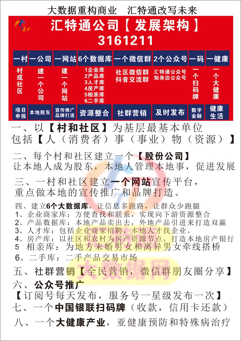 匯特通公司重點打造社區(qū)農(nóng)村1161211鄉(xiāng)村振興服務(wù)體系。一公司,一網(wǎng),6庫。一群,2公眾號。一支付,一健康的71服務(wù)體系建設(shè)。一公司:社區(qū)農(nóng)村鄉(xiāng)村振興有限公司。方便更多民眾創(chuàng)業(yè)投資。一網(wǎng):每個社區(qū)農(nóng)