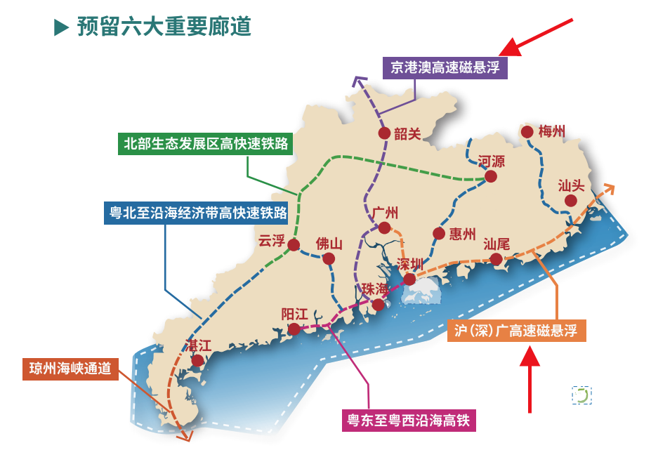 四大超級工程《廣東省國土空間規(guī)劃(2020—2035年)》提出,在交通方面要預(yù)留6大廊道(見下圖):這6大廊道,包括四大工程?!熬└郯母咚俅艖腋 ?、“滬深廣高速磁懸浮”、“粵東至粵西沿海高鐵”、“瓊州