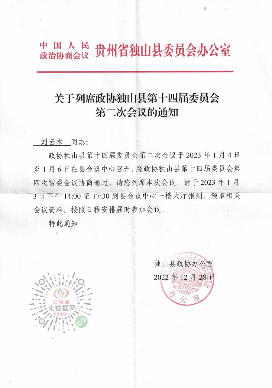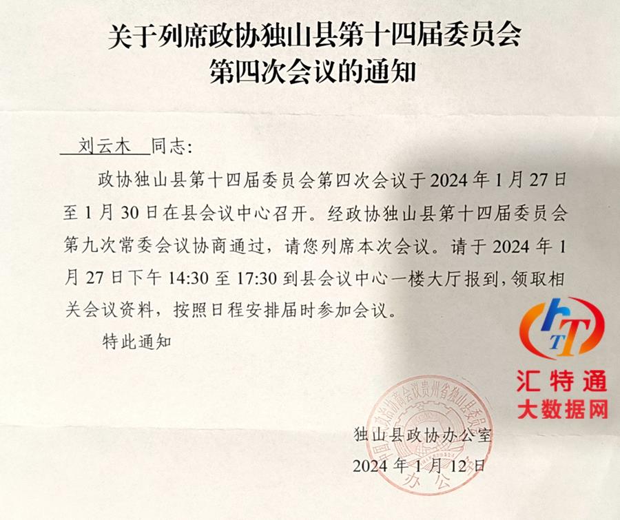 祝賀匯特通公司劉云木列席獨(dú)山縣2024年1月28號(hào)兩會(huì)召開(kāi)政協(xié)獨(dú)山縣第十四屆委員會(huì)第四次會(huì)議于2024年1月27日至1月30日在獨(dú)山縣會(huì)議中心召開(kāi)。經(jīng)政協(xié)獨(dú)山縣第十四屆委員會(huì)第九次常委會(huì)議協(xié)商通過(guò),請(qǐng)
