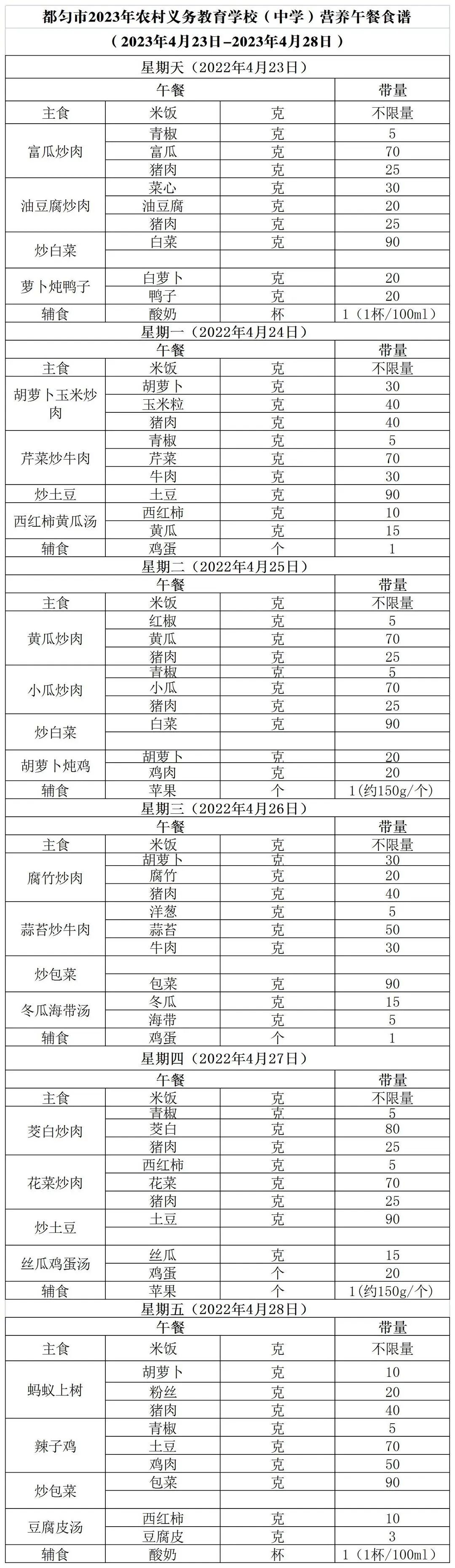 貴州省黔南州都勻市2023年4月23日至4月28日義務(wù)教育學(xué)生營養(yǎng)午餐食譜公示根據(jù)《都勻市農(nóng)村義務(wù)教育學(xué)生營養(yǎng)改善計劃提質(zhì)行動工作方案》精神,現(xiàn)將2023年4月23日至28日學(xué)生營養(yǎng)午餐食譜公示如下,