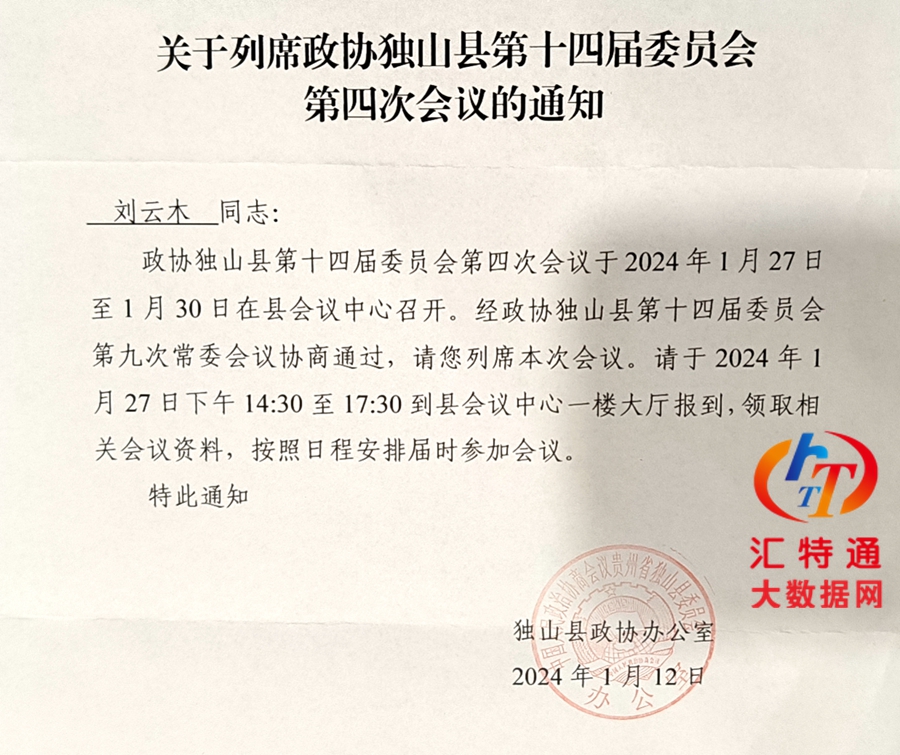 祝賀匯特通公司劉云木列席獨山縣2024年1月28號兩會召開政協(xié)獨山縣第十四屆委員會第四次會議于2024年1月27日至1月30日在獨山縣會議中心召開。經(jīng)政協(xié)獨山縣第十四屆委員會第九次常委會議協(xié)商通過,請