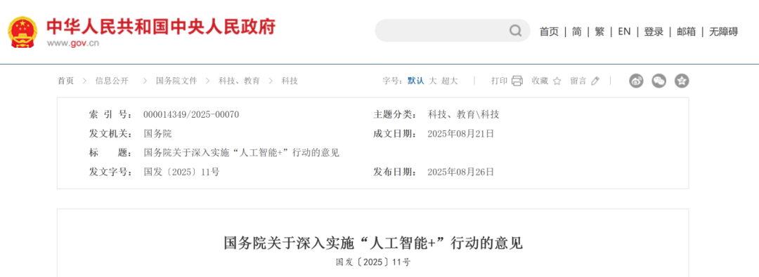 國務(wù)院關(guān)于深入實(shí)施“人工智能+”行動的意見國發(fā)〔2025〕11號各省、自治區(qū)、直轄市人民政府,國務(wù)院各部委、各直屬機(jī)構(gòu):為深入實(shí)施“人工智能+”行動,推動人工智能與經(jīng)濟(jì)社會各行業(yè)各領(lǐng)域廣泛深度融合,重