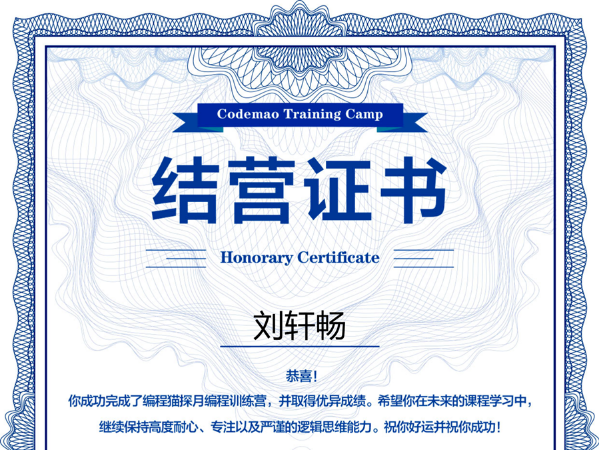 祝賀獨山縣第三小學劉軒暢獲得小學編程貓業(yè)余學習獲得結營證書10月26號經(jīng)過獨山縣第三小學老師的介紹,劉軒暢參加了編程貓業(yè)余培訓班學習,成績優(yōu)異經(jīng)過作品比賽,獲得結營證書。