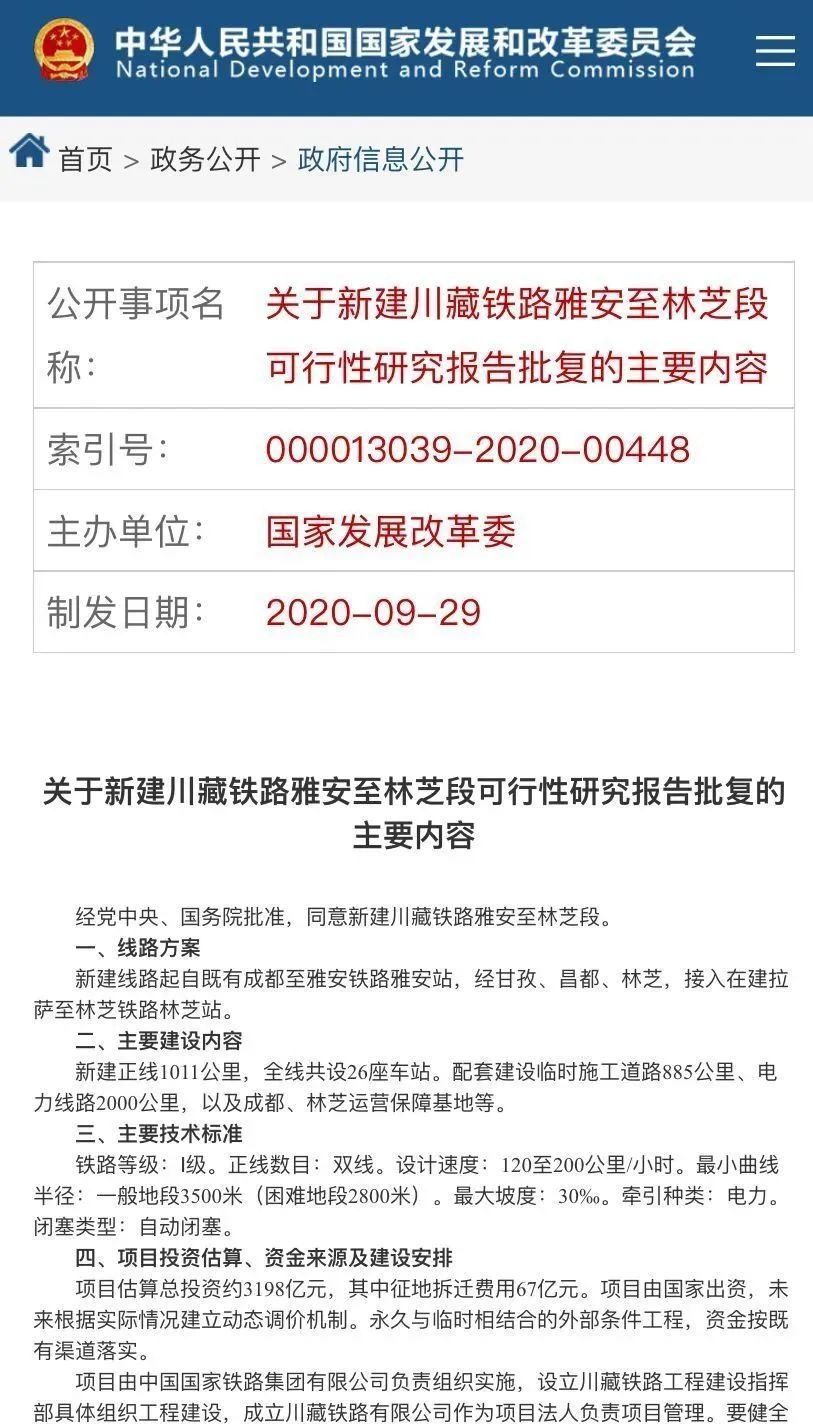 9月30日,記者從國家發(fā)展改革委獲悉,經(jīng)黨中央、國務(wù)院批準(zhǔn),同意新建川藏鐵路雅安至林芝段。國家發(fā)展改革委官網(wǎng)截圖關(guān)于新建川藏鐵路雅安至林芝段可行性研究報告批復(fù)的主要內(nèi)容顯示,新建線路起自既有成都至雅安