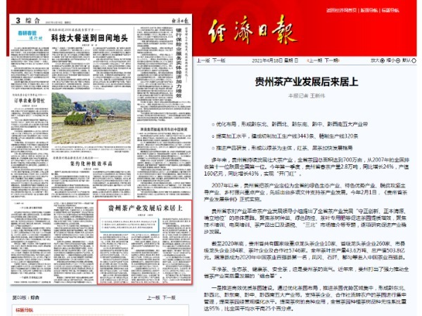 《經(jīng)濟(jì)日報》刊發(fā)《貴州茶產(chǎn)業(yè)發(fā)展后來居上》,強(qiáng)力推動貴州省茶產(chǎn)業(yè)高質(zhì)量發(fā)展的“組合拳”,持續(xù)發(fā)展壯大茶產(chǎn)業(yè)。