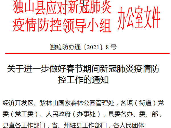 獨山縣經(jīng)濟開發(fā)區(qū)、紫林山國家森林公園管理處,各鎮(zhèn)(街道)黨委(黨工委)、人民政府(辦事處),縣委各辦、委、部,縣直各工作部門,省、州駐縣工作部門,各人民團體:當(dāng)前,我國本土疫情呈零星散發(fā)和局部聚集性疫