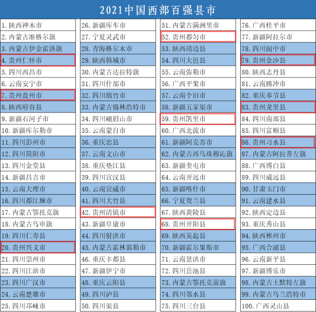 9月23日,競爭力智庫、中國經(jīng)濟(jì)導(dǎo)報社、北京中新城市規(guī)劃設(shè)計研究院等機(jī)構(gòu)聯(lián)合發(fā)布《中國西部地區(qū)縣域發(fā)展監(jiān)測報告2021》(簡稱《報告》),《報告》同時揭曉了“2021中國西部百強(qiáng)縣市”名單。名單顯示,