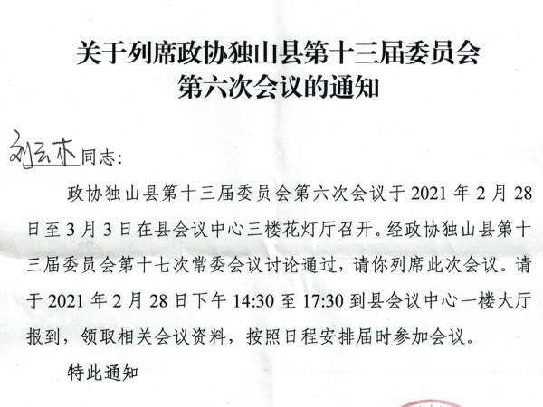 關(guān)于匯特通公司劉云木列席2021年獨山縣政協(xié)第十三屆委員會第6次會議及獨山縣兩會的通知