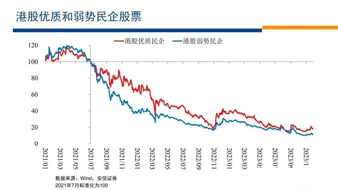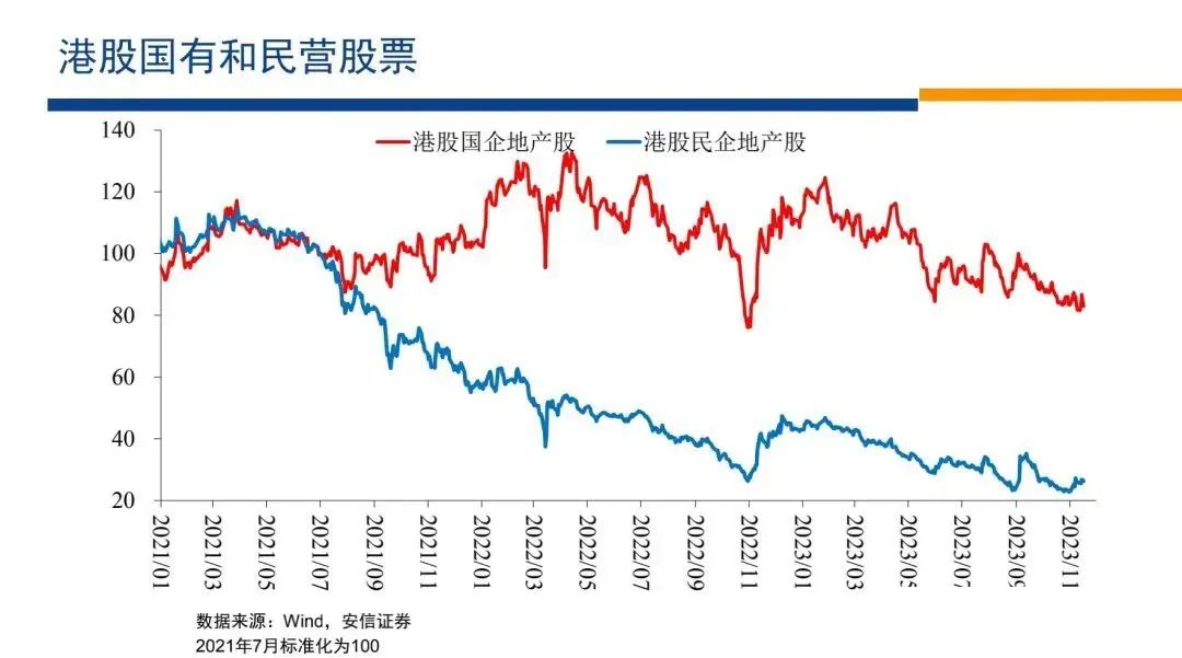 然后我們還可以再看股票市場(chǎng)的情況,我們看到在現(xiàn)金流大幅流出的條件下,民營(yíng)企業(yè)的股票大幅下跌,國(guó)有企業(yè)的股票以2021年7月份為起點(diǎn),沒(méi)有怎么下跌。