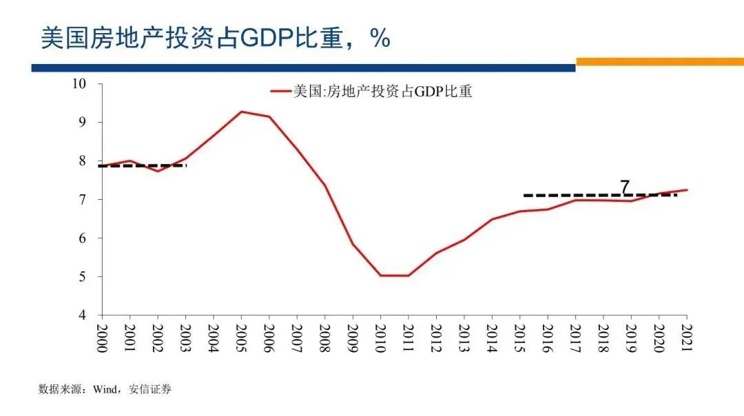 在2014年以后,美國(guó)從房地產(chǎn)泡沫走出來(lái)的背景下,房地產(chǎn)投資的占比,大約在什么水平?大約也是在7%的水平。而在2005年美國(guó)經(jīng)濟(jì)泡沫化之前,房地產(chǎn)投資的占比接近8%。