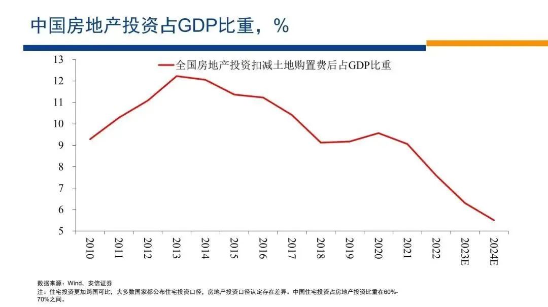 我們?cè)谶@里想補(bǔ)充的事實(shí)是,到2024年的時(shí)候,中國(guó)房地產(chǎn)投資占GDP的比重應(yīng)該就會(huì)跌破6%,也許會(huì)跌到5.5%、5.7%左右的水平。