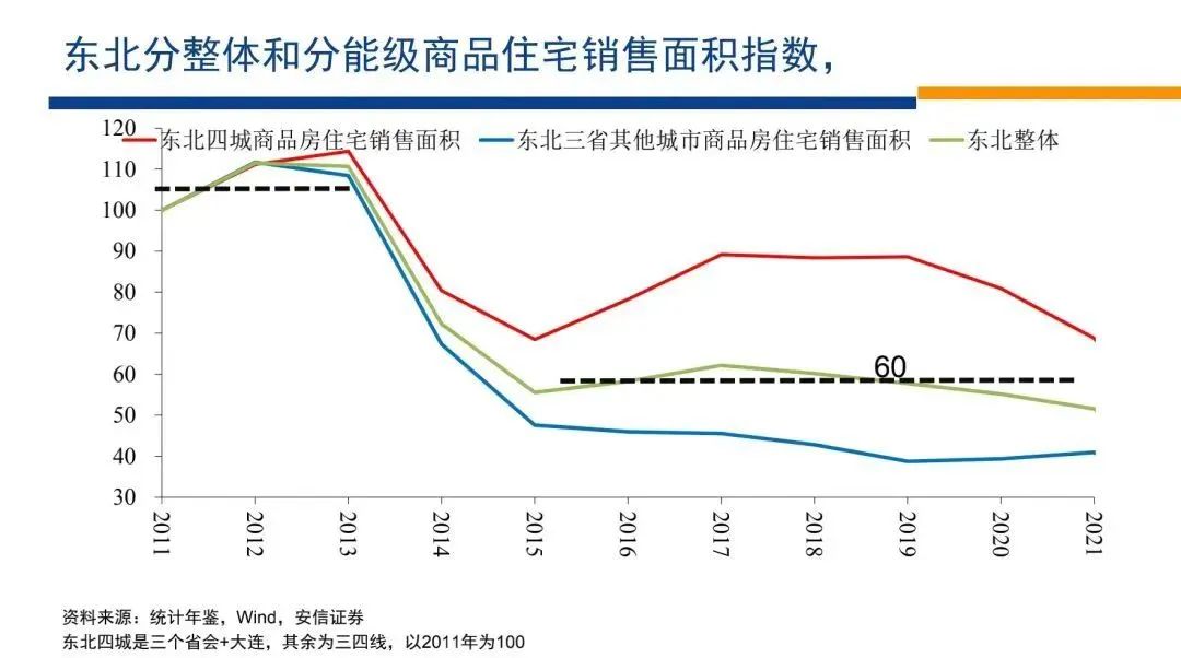 這個(gè)是我們想說(shuō)的第三個(gè)方面比較主要的原因。那么這些原因毫無(wú)疑問(wèn)都有關(guān)系,但是如果我們觀察東北四城的影響,就是教培的整頓,互聯(lián)網(wǎng)的整頓等等,也許對(duì)他們的影響沒(méi)有那么大,但是東北4城的相對(duì)表現(xiàn)跟全國(guó)是一樣的。而東北4城房地產(chǎn)市場(chǎng)經(jīng)歷劇烈調(diào)整以后,實(shí)際上它后來(lái)處在一個(gè)相對(duì)全國(guó)更弱的水平上。