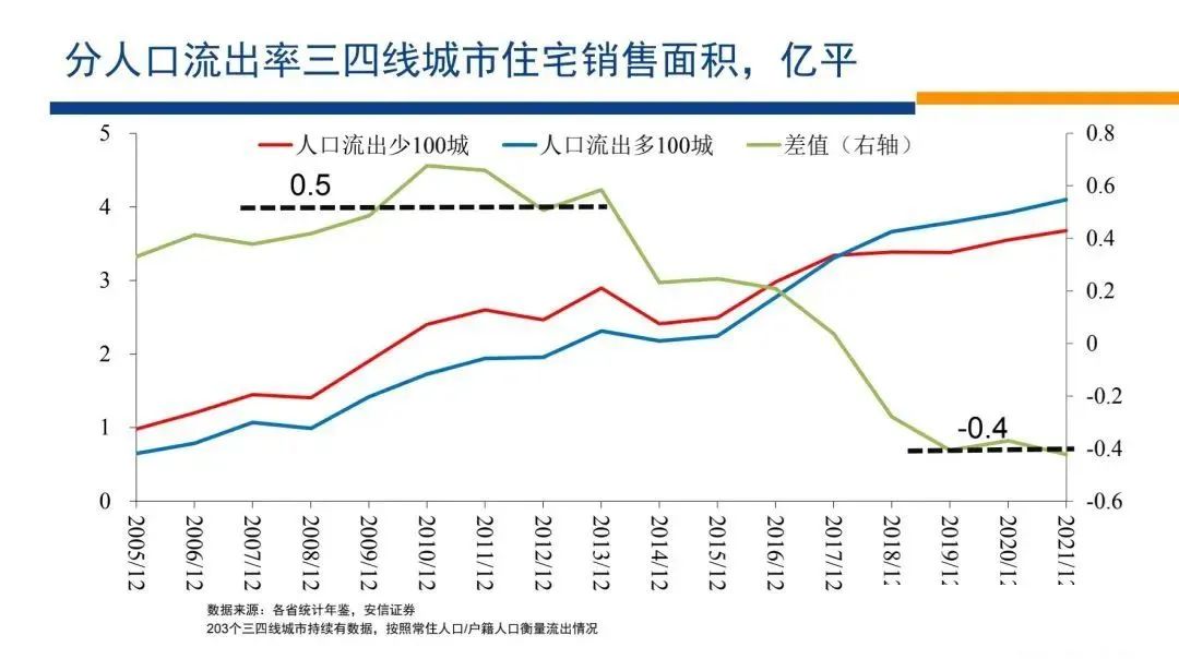 我們看到在2013年之前,在本地生活的人口多,人口流出少的城市,房子確實(shí)賣得更多,人口流出少的城市,比人口流出多的城市,房子每年大概要多賣5,000萬(wàn)平米。