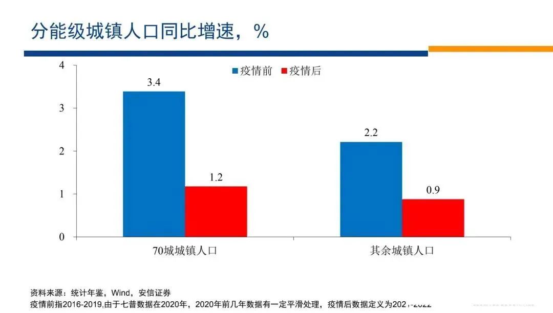我們觀察第一個(gè)就是疫情之前跟疫情期間相比,城鎮(zhèn)人口的增速,我們看到70大城市疫情之前,城鎮(zhèn)人口增速的均值是3.4,疫情以來(lái)下降到1.2,下降了2.2個(gè)百分點(diǎn),而小城市從2.2下降到0.9,下降了1.3個(gè)百分點(diǎn)。
