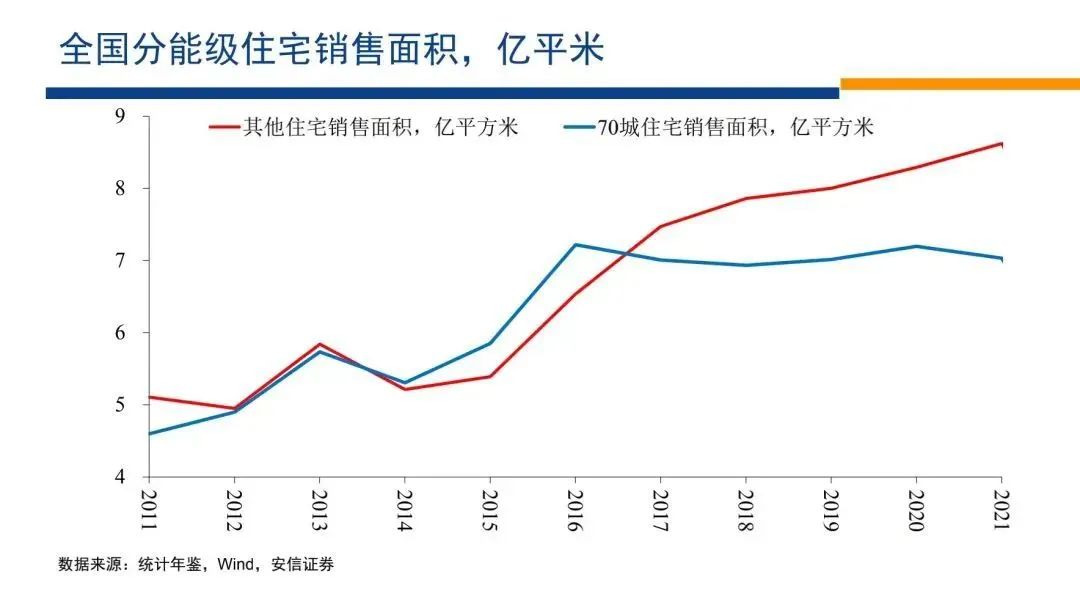 盡管每年人口增長(zhǎng)超過(guò)3%,但是住宅的絕對(duì)銷售規(guī)模就穩(wěn)定在7億平米不再增長(zhǎng),但是大量的中小城市住宅的銷售規(guī)模,卻快速的上升到接近9億平米的水平。