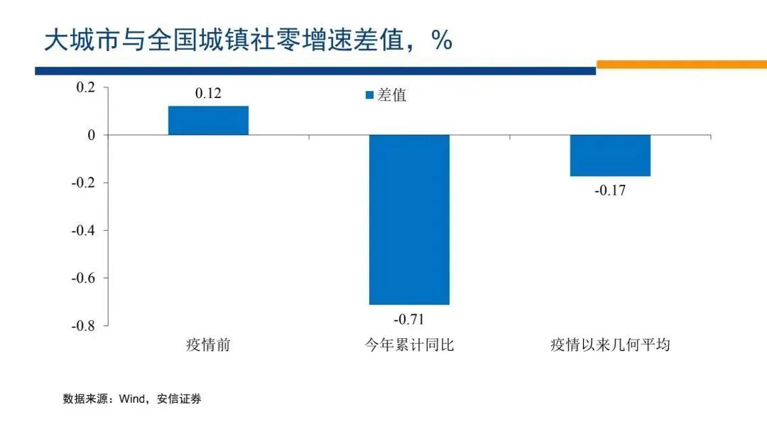 我們?cè)倏瓷鐣?huì)消費(fèi)品零售,在疫情之前,大城市的零售比小城市要快0.1個(gè)點(diǎn),但是今年以來(lái)它要慢0.7個(gè)點(diǎn),在疫情以來(lái)要慢0.2個(gè)點(diǎn)。就從零售端來(lái)講,大城市也受到了更大的打擊,今年以來(lái)相對(duì)小城市,大城市的恢復(fù)顯著更慢。