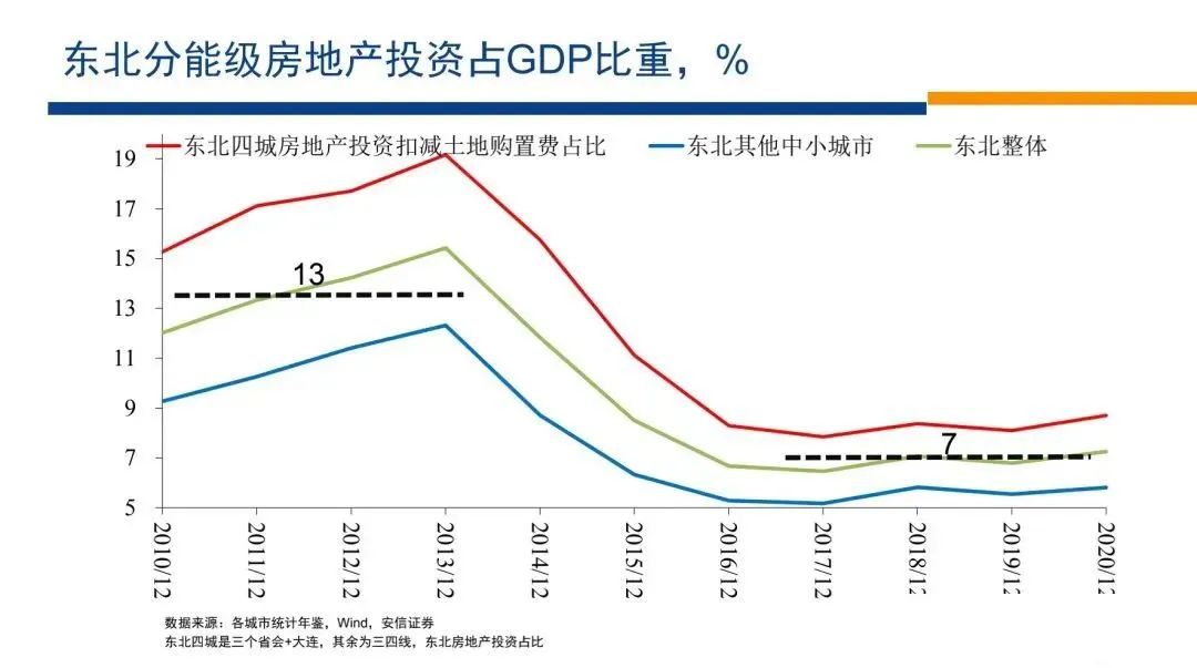 房地產(chǎn)投資就東北整個(gè)全境而言,基本上在7%左右的水平上穩(wěn)定下來(lái)。這是建立在東北快速的人口進(jìn)入城市的過(guò)程已經(jīng)結(jié)束,在人口大量流入城市的城市化基本上接近尾聲的背景下,所建立起來(lái)的水平。