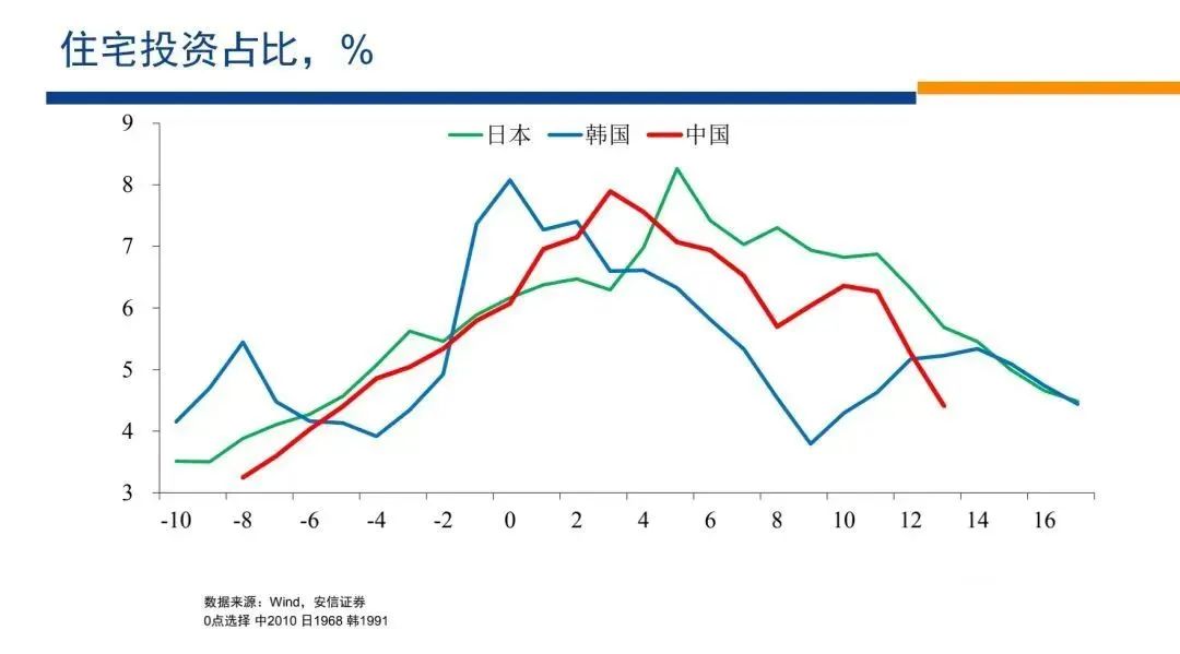 中國(guó)住宅投資占GDP的比重,即便在它最峰值的水平,相對(duì)日韓相似的發(fā)展階段,基本上是在一個(gè)段位上,并沒(méi)有顯著的更高。走過(guò)這個(gè)峰值之后,住宅投資占GDP的比重都開(kāi)始下降,但是中國(guó)的下降過(guò)程相對(duì)他們而言,也沒(méi)有顯著的變得更緩慢。