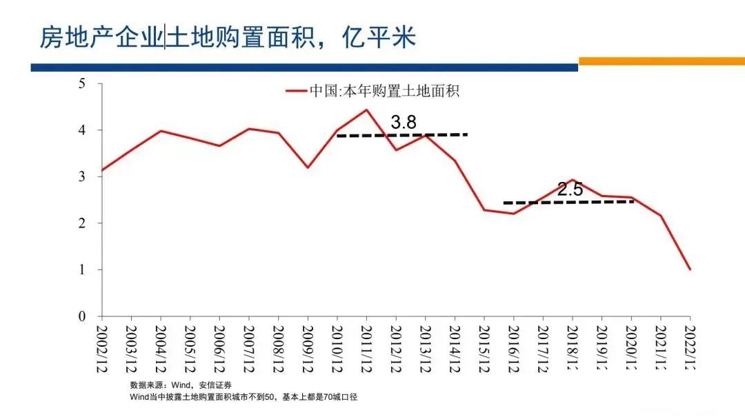 我們?cè)賮?lái)從房地產(chǎn)企業(yè)的角度來(lái)看問(wèn)題,它的土地購(gòu)置面積從3.8億平米下降到2.5億平米。