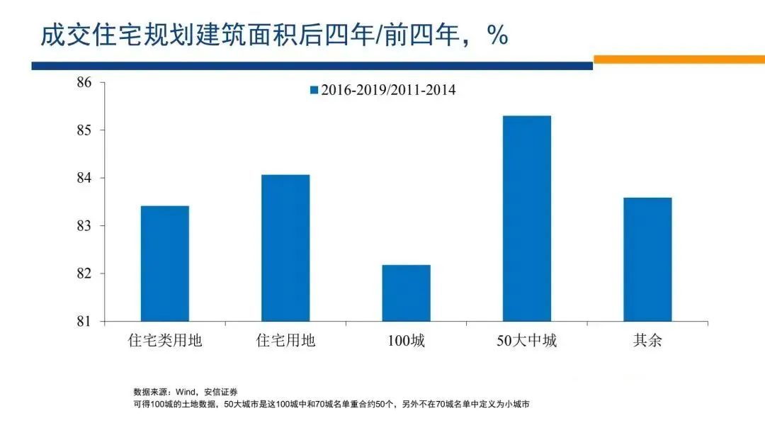 這個(gè)因素做一個(gè)合并,比如說(shuō)合并為住宅用地,我們都看到了這個(gè)規(guī)劃建筑面積的下降,然后把住宅類的用地進(jìn)一步分成大中小城市,我們看到了絕對(duì)面積的下降,然后我們計(jì)算為這樣一個(gè)指標(biāo),就是后4年,16~19年,住宅類土地的建筑面積相當(dāng)于前4年的多少?